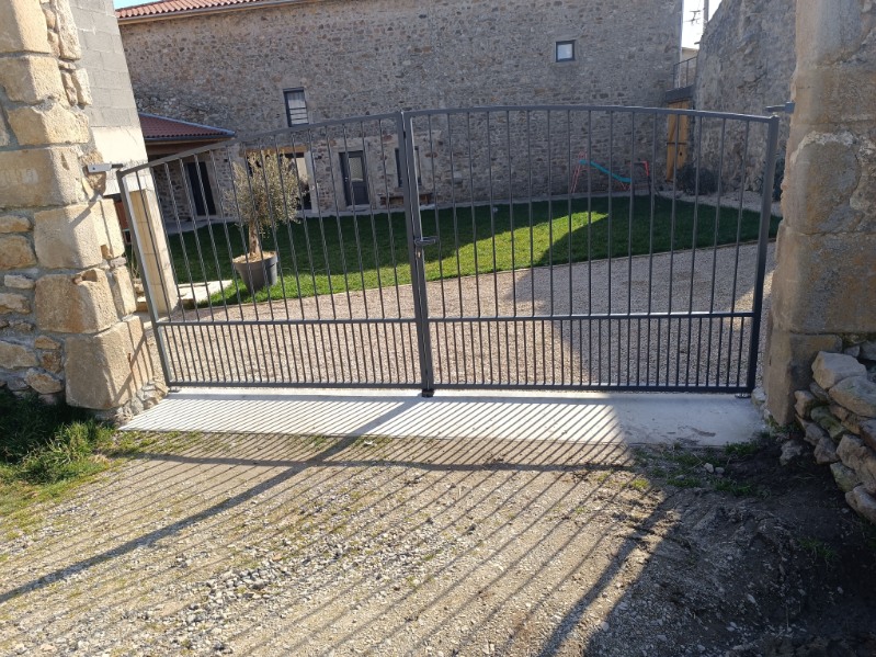 Le portail est composé de deux vantaux à ouverture manuelle, avec un remplissage en barreaux verticaux. Ce choix permet de conserver l’authenticité du lieu tout en apportant une touche contemporaine.