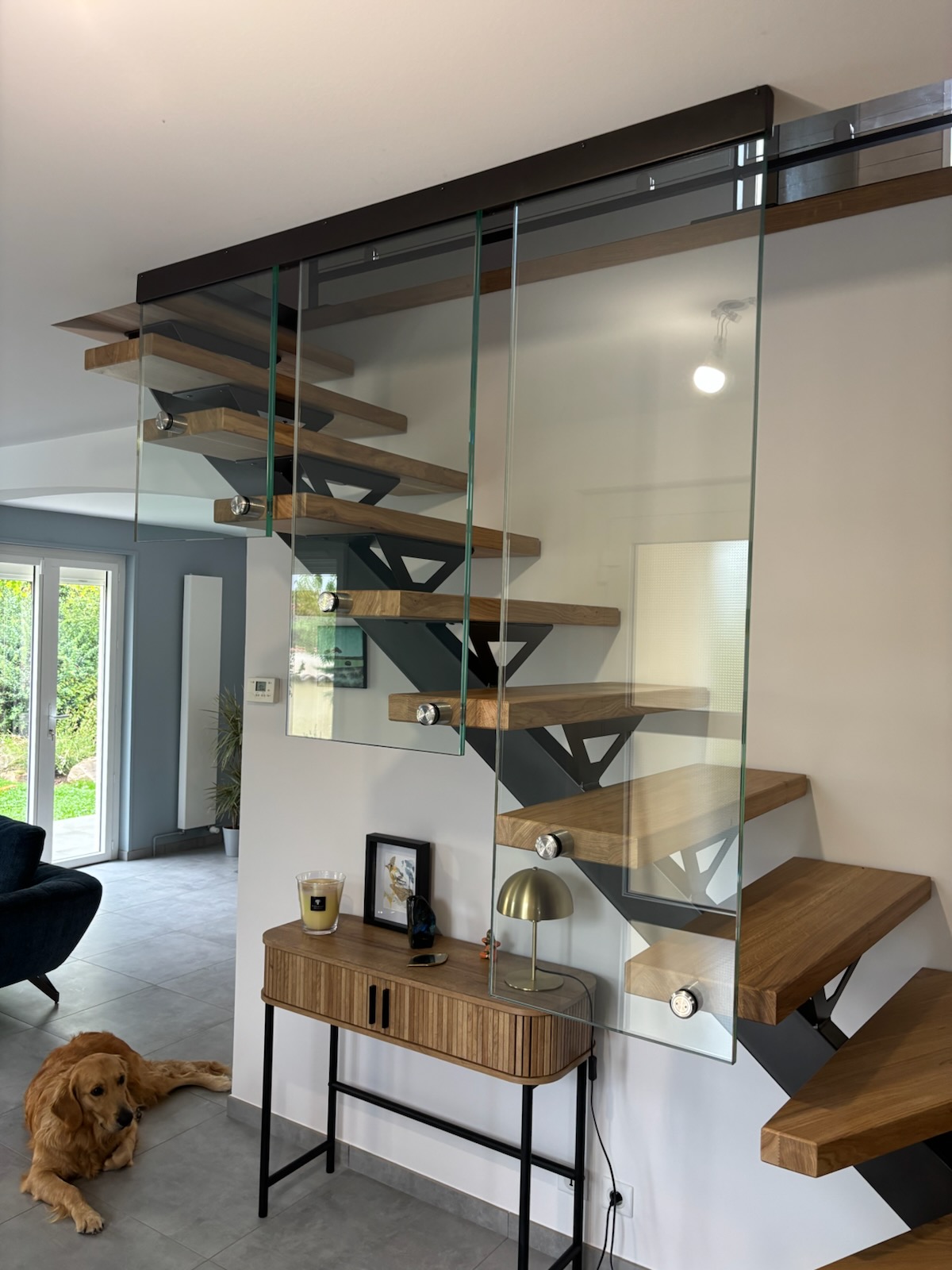 Ce nouvel escalier a totalement transformé l’intérieur de cette maison. L’espace est devenu plus lumineux, plus moderne et beaucoup plus fonctionnel. Le mélange acier/bois apporte à la fois caractère et élégance, tandis que la transparence du garde-corps souligne la fluidité de l’ensemble et laisse passer toute la lumière naturelle.